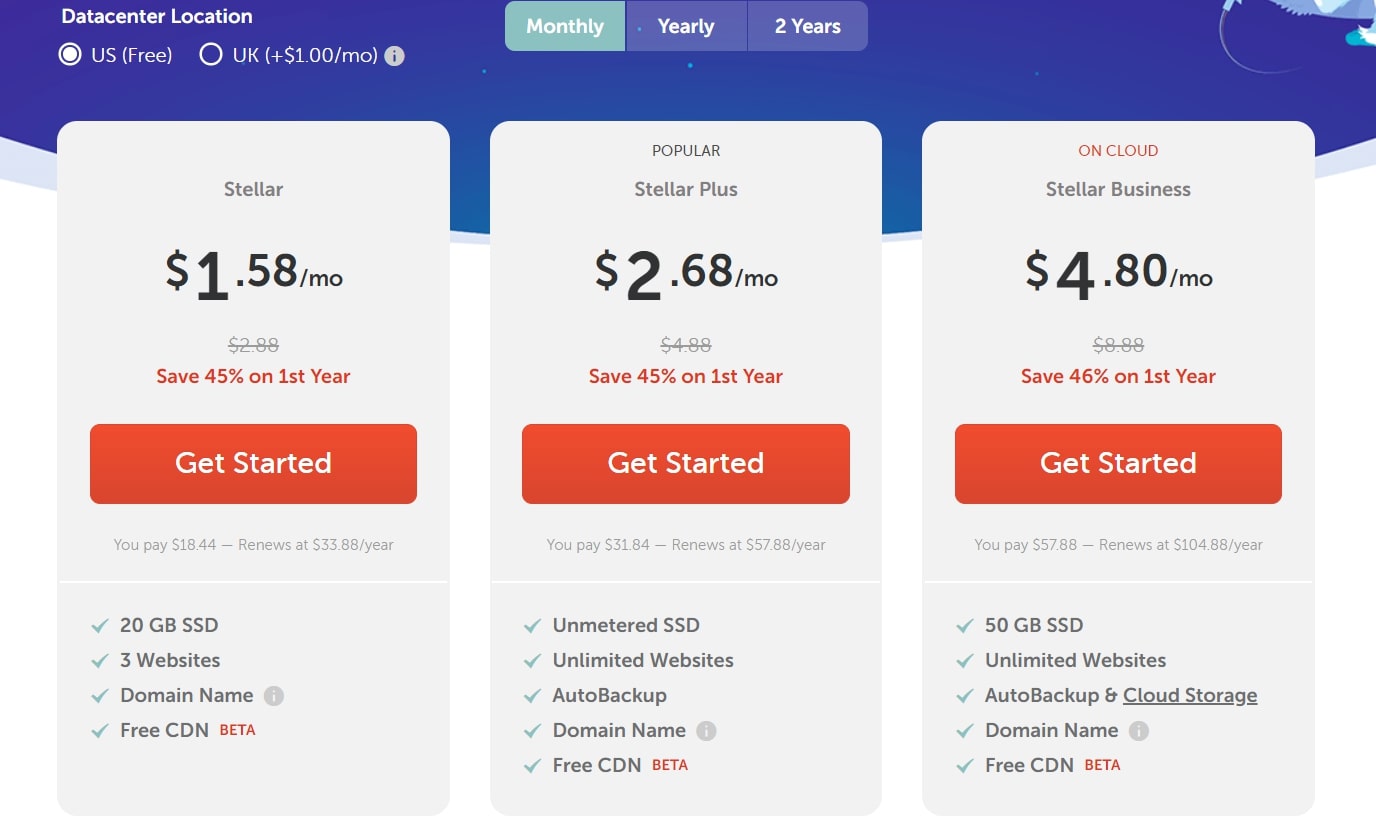 When it comes to shared hosting, prices start from but $ane.58 a month for a Stellar subscription. This renews at $2.88 a calendar month after the outset year. You will be able to connect three websites and accept 20GB of storage, unmetered bandwidth, one costless domain name, and admission to a free website builder.